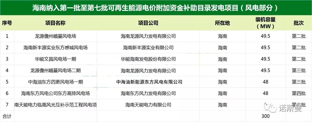 海南省纳入可再生能源电价附加资金补助目录发电项目的项目共18个,累计装机容量为479MW。其中风电项目有7个,累计装机容量为300MW。