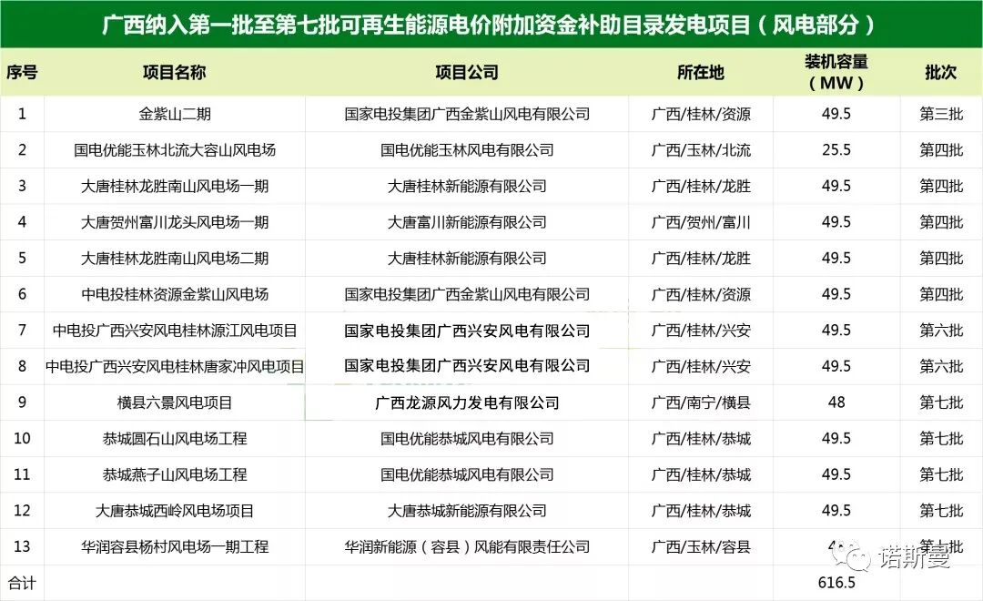 另外,广西省和海南省还公示了纳入第一批至第七批可再生能源电价附加资金补助目录的项目。其中,广西省纳入可再生能源电价附加资金补助目录发电项目的项目共29个,累计装机容量为1000.35MW。其中风电项目有13个,累计装机容量为616.5MW。